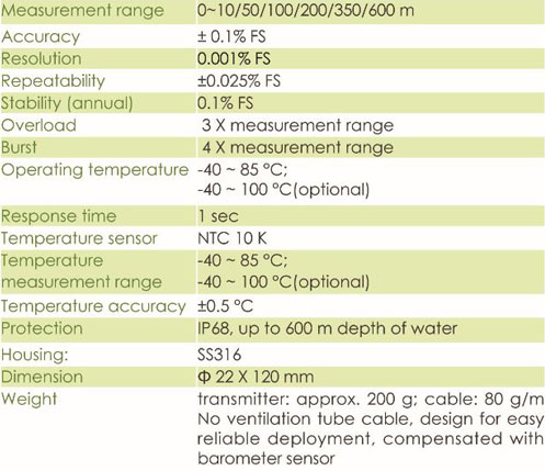 DW-Y02 เซ็นเซอร์ชุดที่เหมาะอย่างยิ่งสำหรับการใช้งานในการใช้งานที่ขนาดที่เล็กกว่าเป็นข้อได้เปรียบเช่นบ่อน้ำประปาในเขตเทศบาลเมืองโครงการชลประทาน ฯลฯ.การก่อสร้างไทเทเนียมยังทำให้อุปกรณ์ที่เหมาะสำหรับการใช้งานตรวจวัดน้ำทะเล.ซิลิคอนเซ็นเซอร์แรงดันสูงให้ประสิทธิภาพที่ดีเยี่ยมและความต้านทานต่อแรงกระแทกและการสั่นสะเทือน.ยากสายยูรีเทน, เป็นแม่พิมพ์ให้กับร่างกายสมองให้สมบูรณ์สูงประกอบกันน้ำ.สายเคเบิลมีความเข้มแข็งเพื่อให้แน่ใจว่าจะไม่มีการยืดตัวที่วัดได้เมื่อสายถูกหย่อนลงไปในหลุมลึก.ที่แยกได้อย่างเต็มที่เพื่อให้แน่ใจว่าการออกแบบไทเทเนียมวัดความน่าเชื่อถือระยะยาวในน้ำและการจัดการน้ำเสียอุตสาหกรรมกระบวนการและการใช้งานทางทะเล